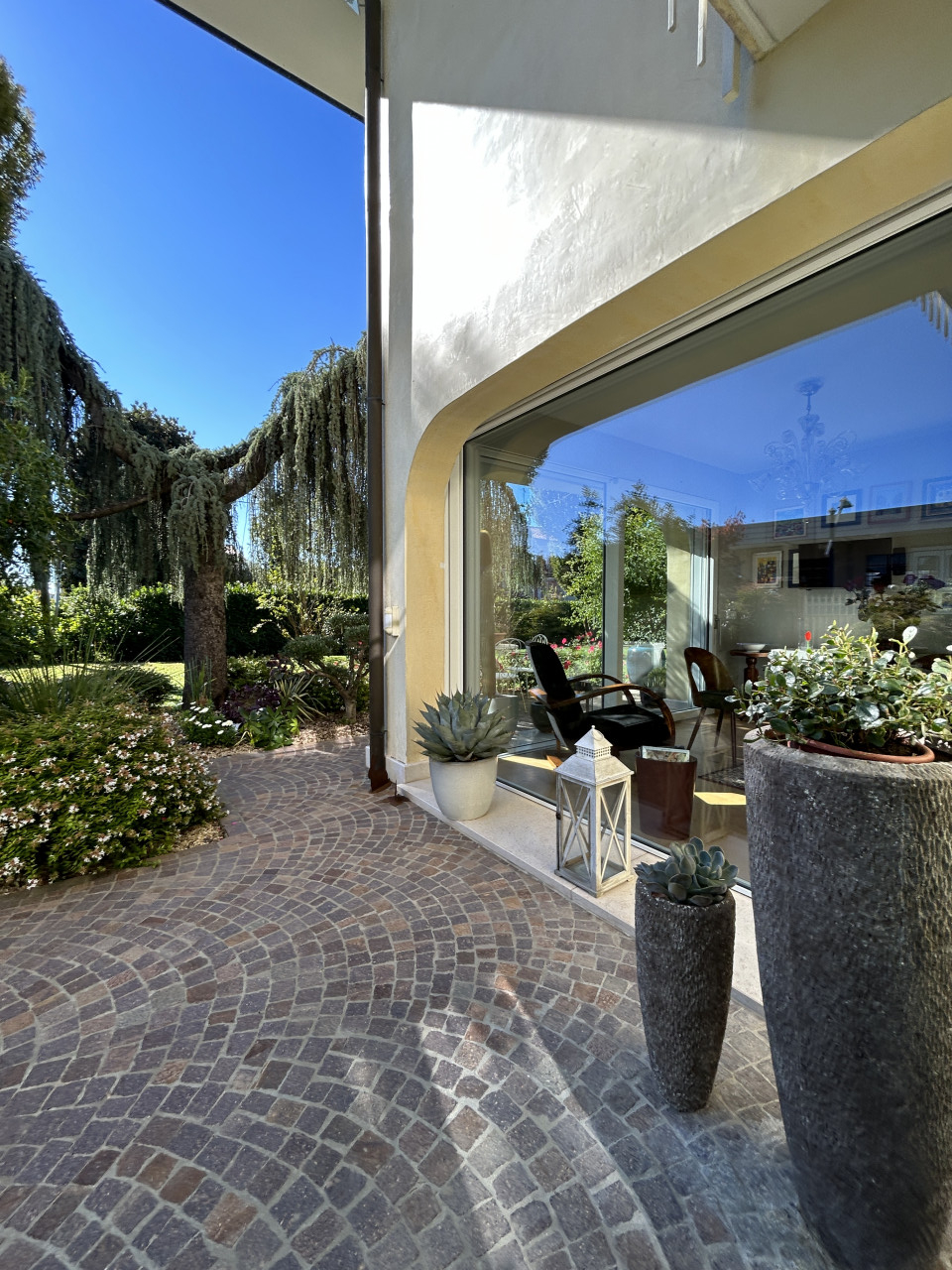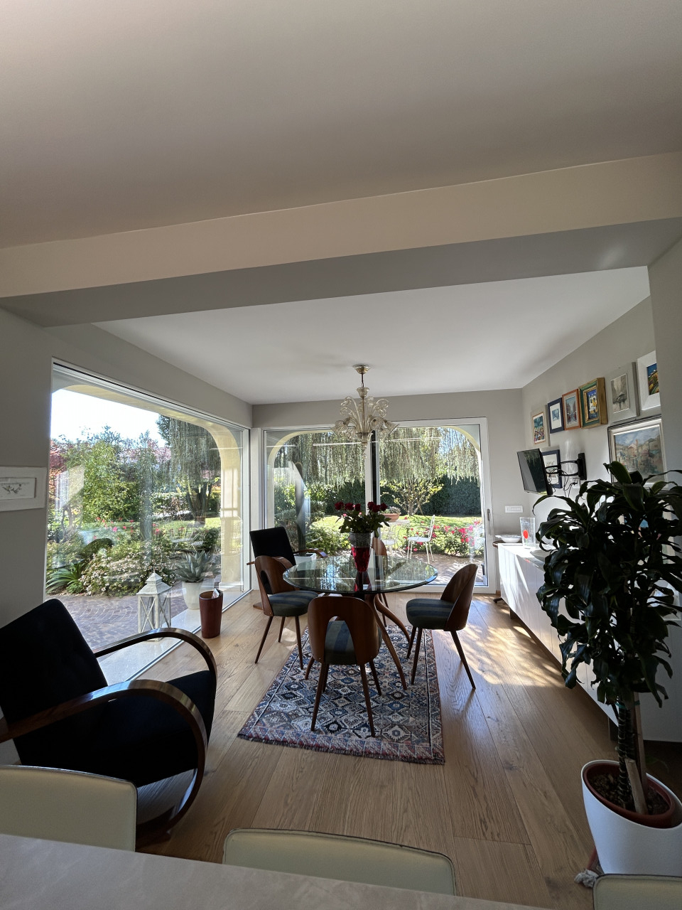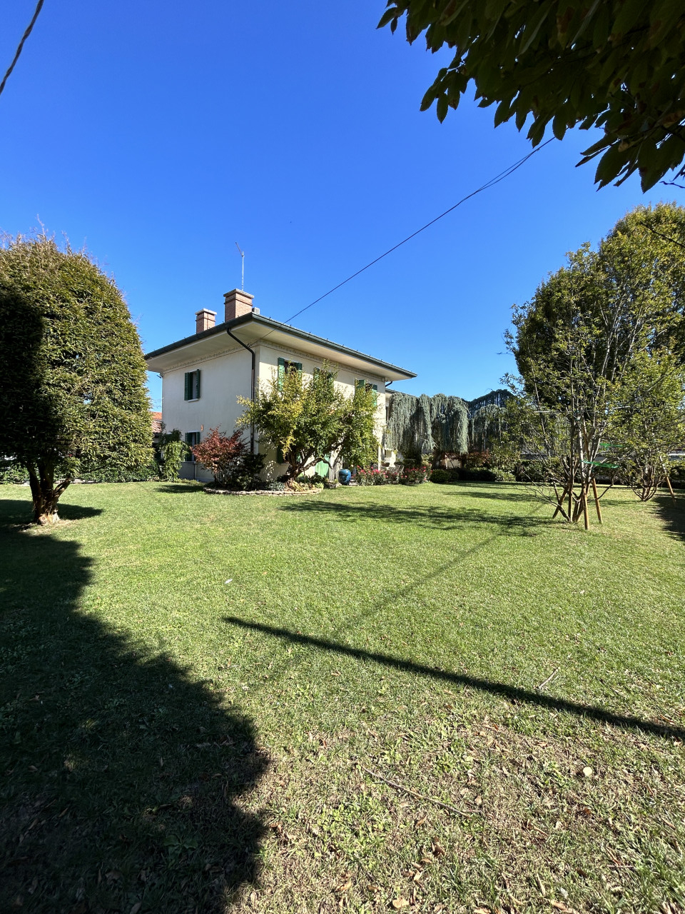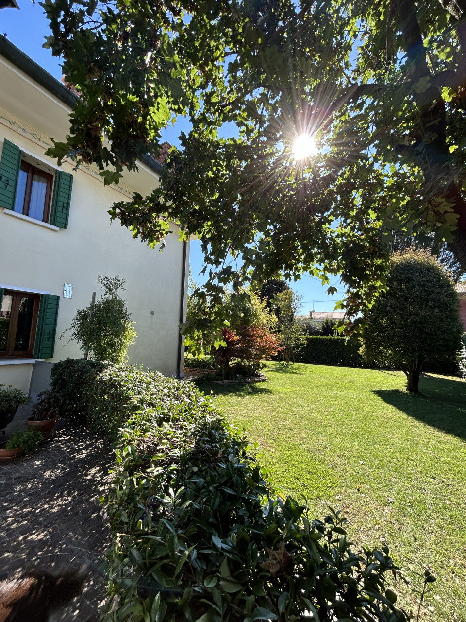 Noale, proponiamo in vendita una raffinata casa singola che si distingue per la luminosissima zona giorno grazie alle grandi vetrate che affacciano sul curato giardino privato.